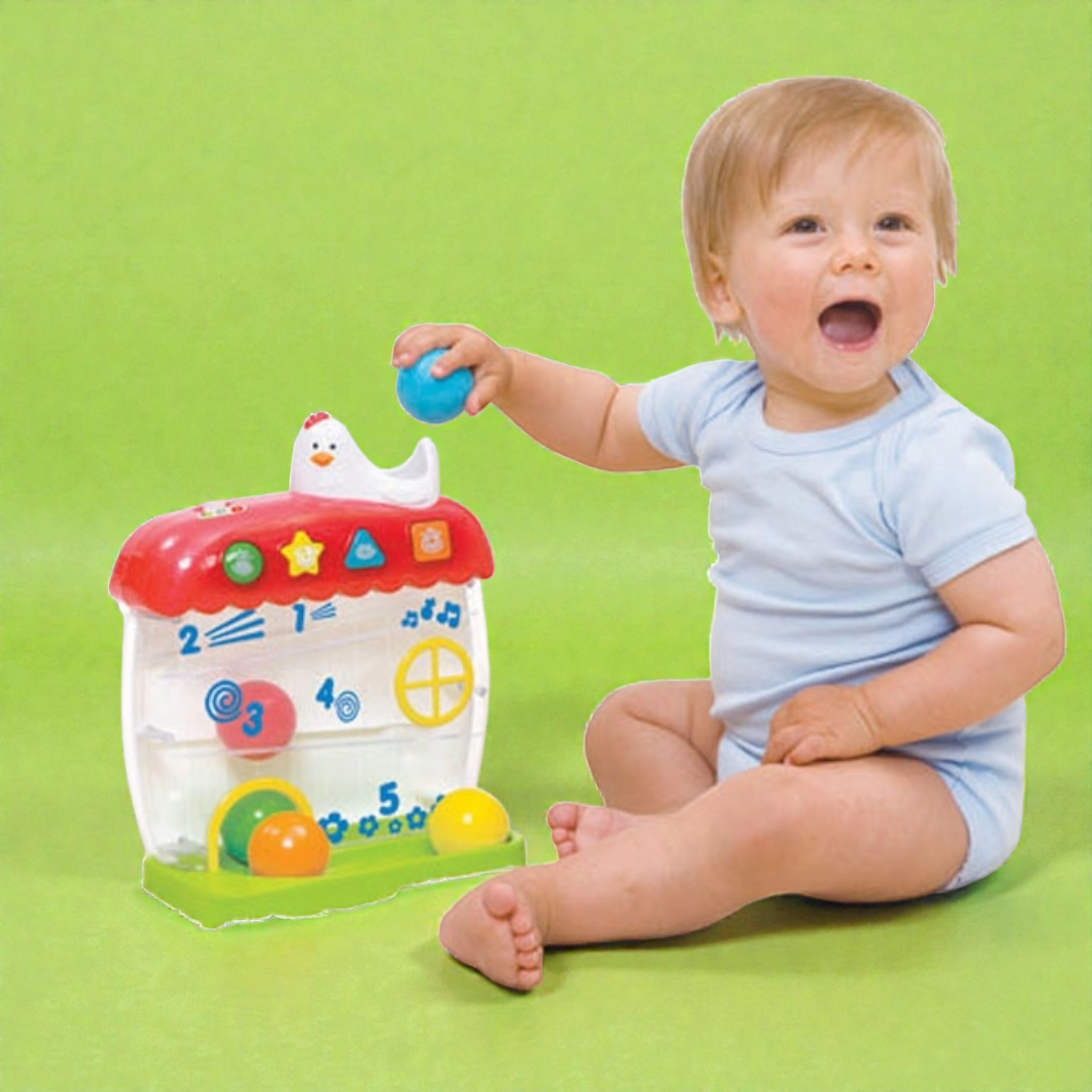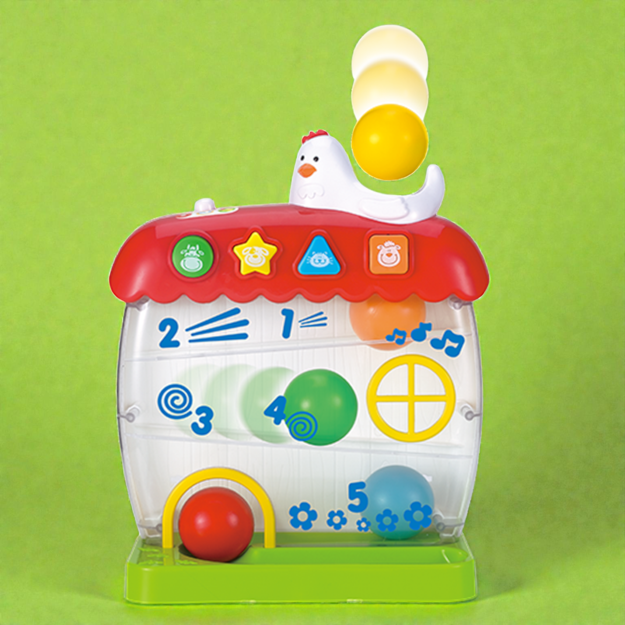 حول التعلم إلى لعبة ممتعة في بيت المزرعة! تتميز هذه اللعبة بوضعَي تشغيل: وضع التعلم الذي يعلم الأرقام، الأشكال، والحيوانات، ووضع الموسيقى الذي يشغل ألحاناً مرحة ومؤثرات صوتية. يمكن للأطفال إطعام الكرات الملونة عبر فتحة الدجاجة ومشاهدتها وهي تنزلق، مما يطور التنسيق الحركي الدقيق والتعرف على الألوان والأرقام من 1 إلى 5. تصميم آمن وجذاب للأطفال من عمر 9 أشهر فما فوق.
