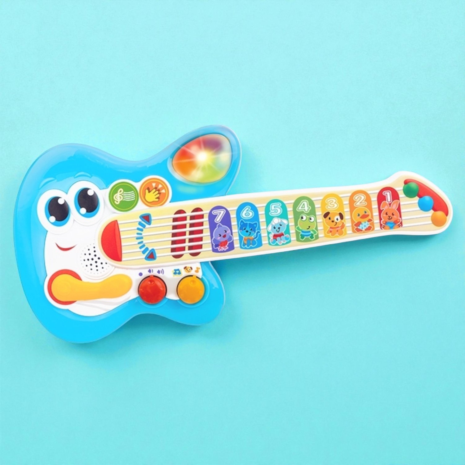 امنح طفلك فرصة ليكون نجم الروك الصغير! هذا الجيتار المصمم للأطفال يضم أزراراً ناعمة الملمس وإضاءات وامضة. يوفر 3 أوضاع لعب: “العزف الحر”، “أصوات الحيوانات”، و”العزف مع الألحان”، بالإضافة إلى ذراع “وامي بار” (Whammy bar) لأصوات المؤثرات وزر للإيقاع والتصفيق. تساعد ميزة “اللمس الناعم” على استكشاف أصوات جديدة وتطوير المهارات السمعية والحركية الدقيقة.