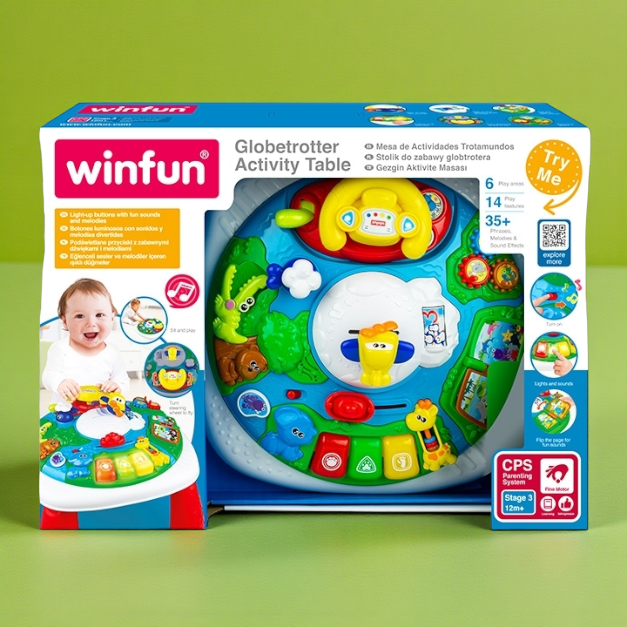 انطلق في مغامرة حول العالم من غرفة المعيشة! طاولة الأنشطة هذه هي وجهة تعليمية آسرة ومليئة بالأنشطة التفاعلية. يمكن لطفلك تدوير عجلة القيادة لتحريك الطائرة، تقليب صفحات الكتاب، تحريك ذراع التروس، والضغط على الأزرار المضيئة التي تصدر أصواتاً وألحاناً مبهجة. تساعد مجموعة الأنشطة المتنوعة على تحسين التنسيق الحركي الدقيق، الخيال، والتعرف على الألوان والأصوات.