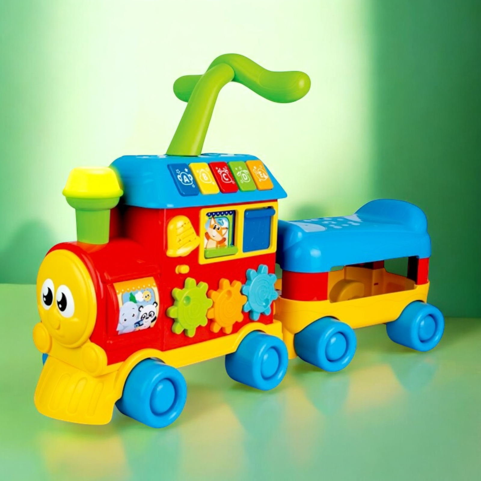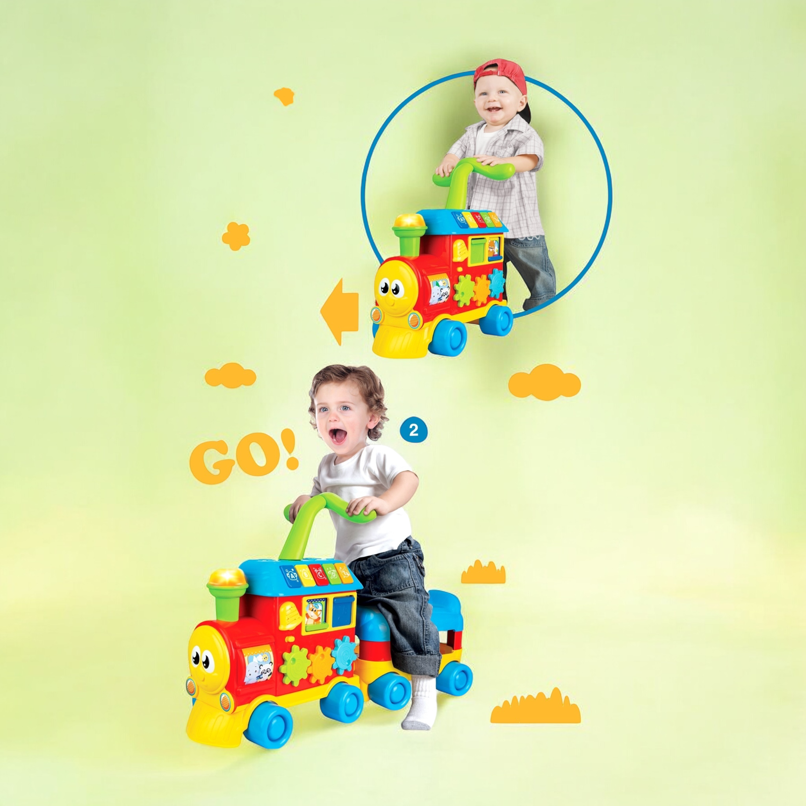 - قطار ركوب (Ride-on): يتضمن مقطورة قابلة للفك والتركيب تتيح للطفل الجلوس والركوب والانطلاق بمرح في أرجاء المنزل.