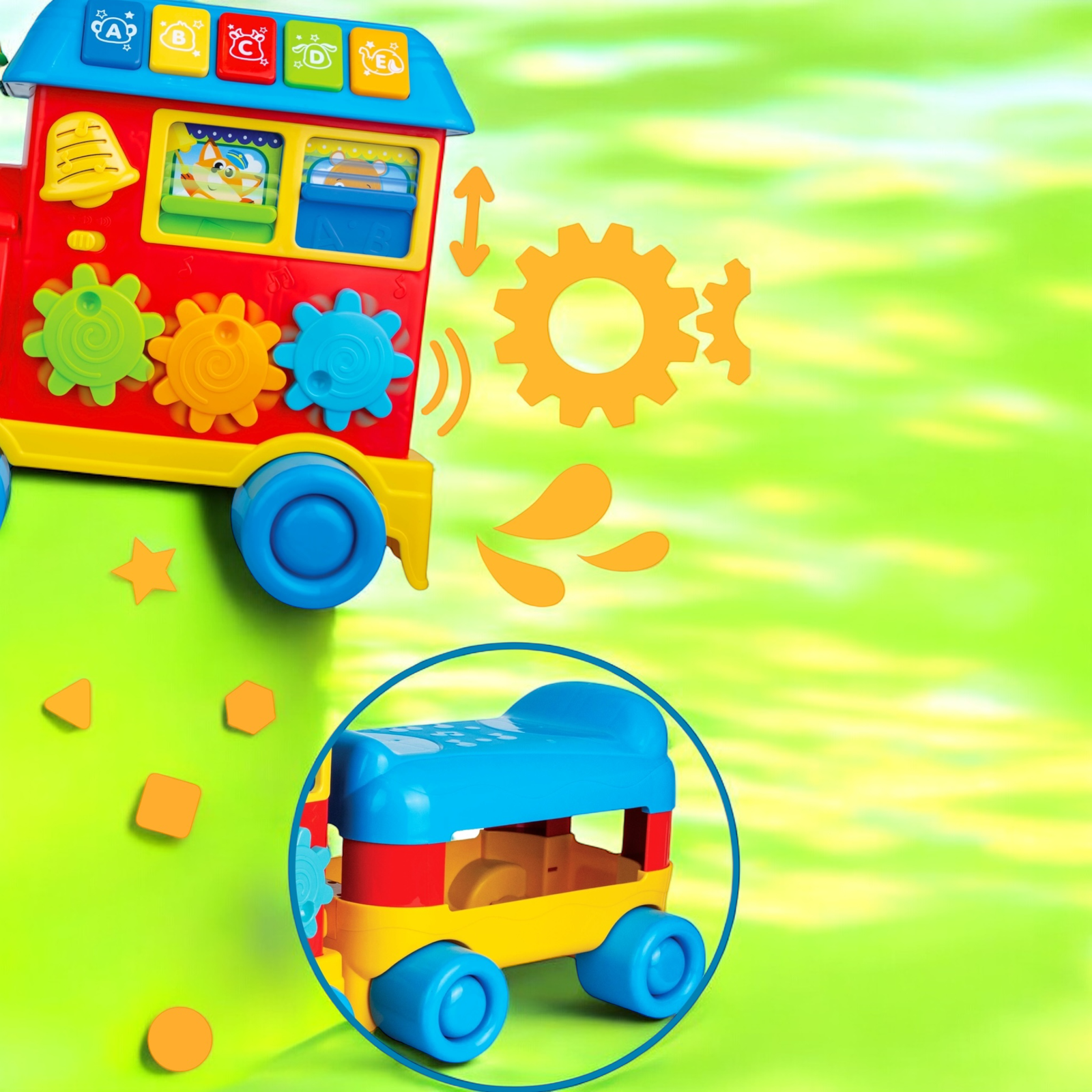 - اللعب الأرضي التفاعلي: يضم مركز أنشطة مدمج يحتوي على أزرار مضيئة، تروس متحركة، ومؤثرات صوتية تعلم الحروف والألوان والأرقام.