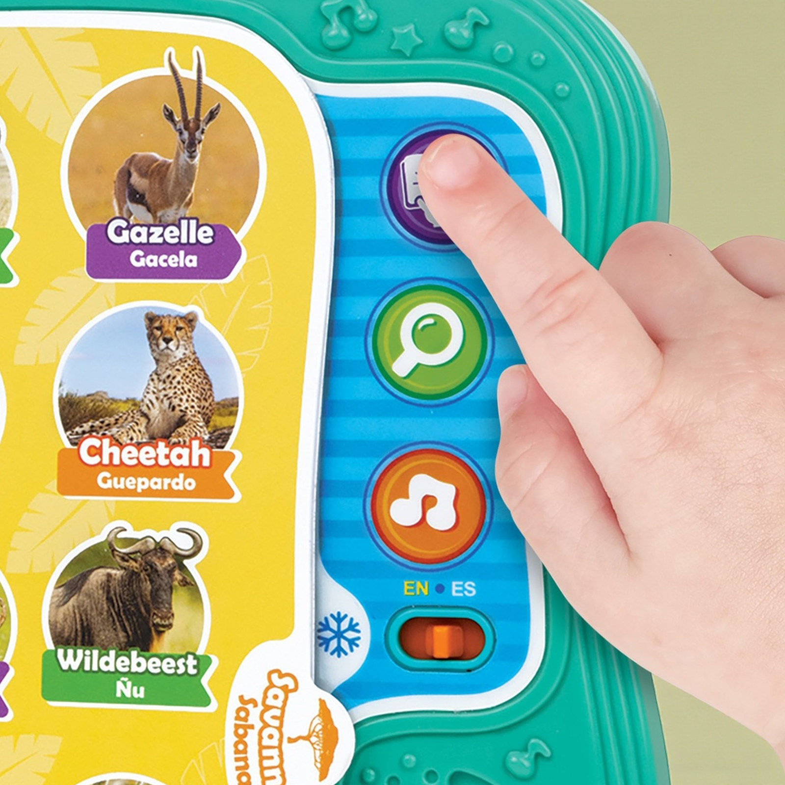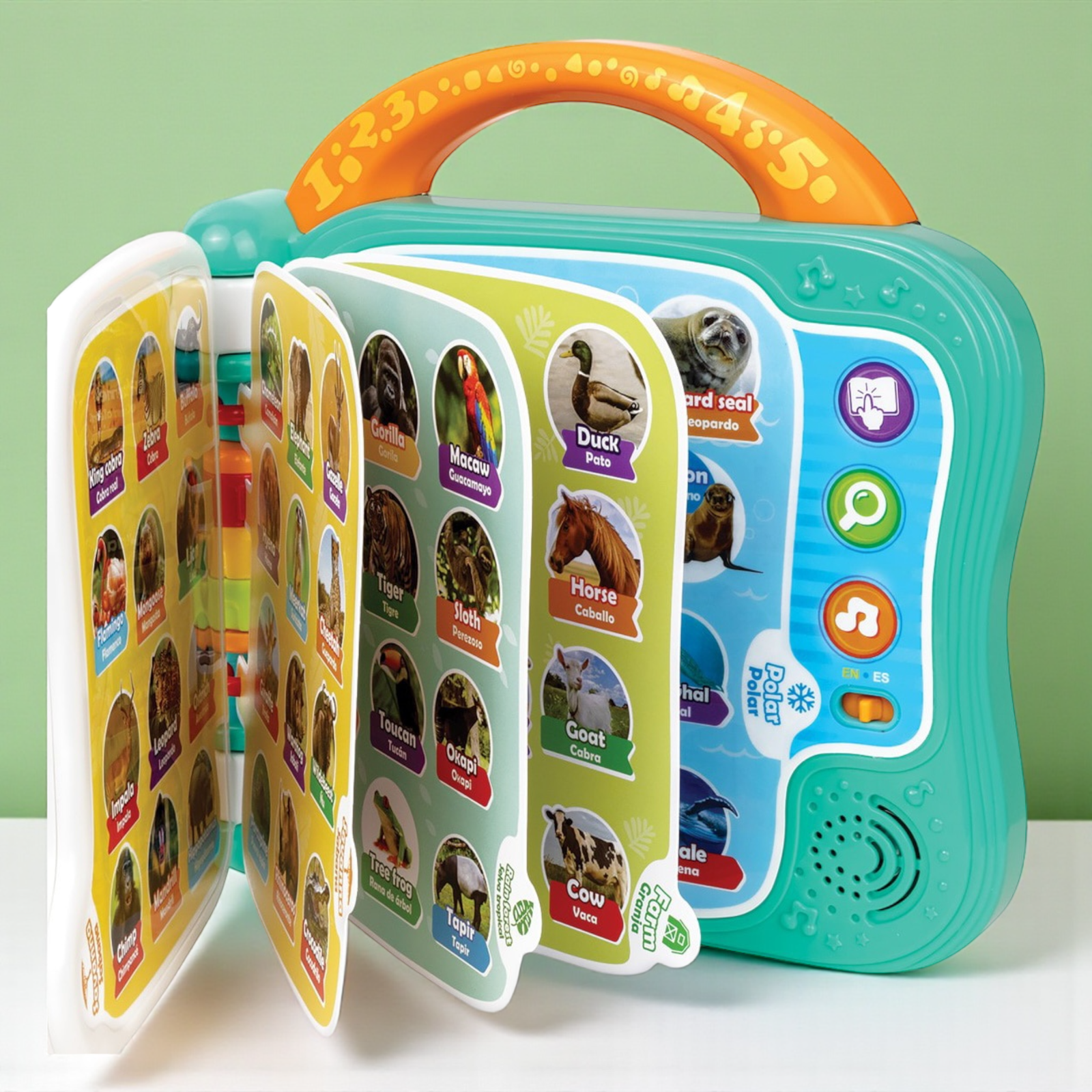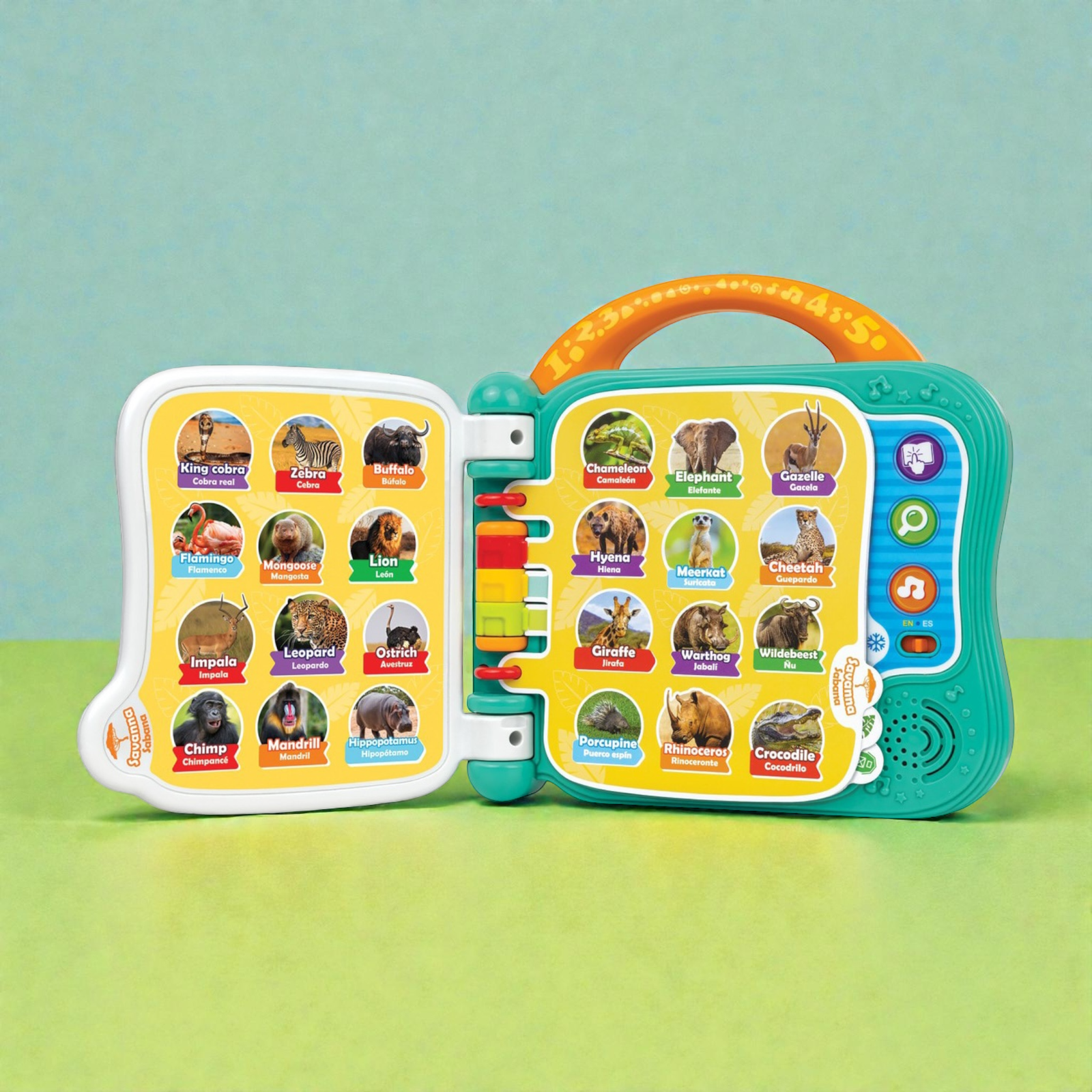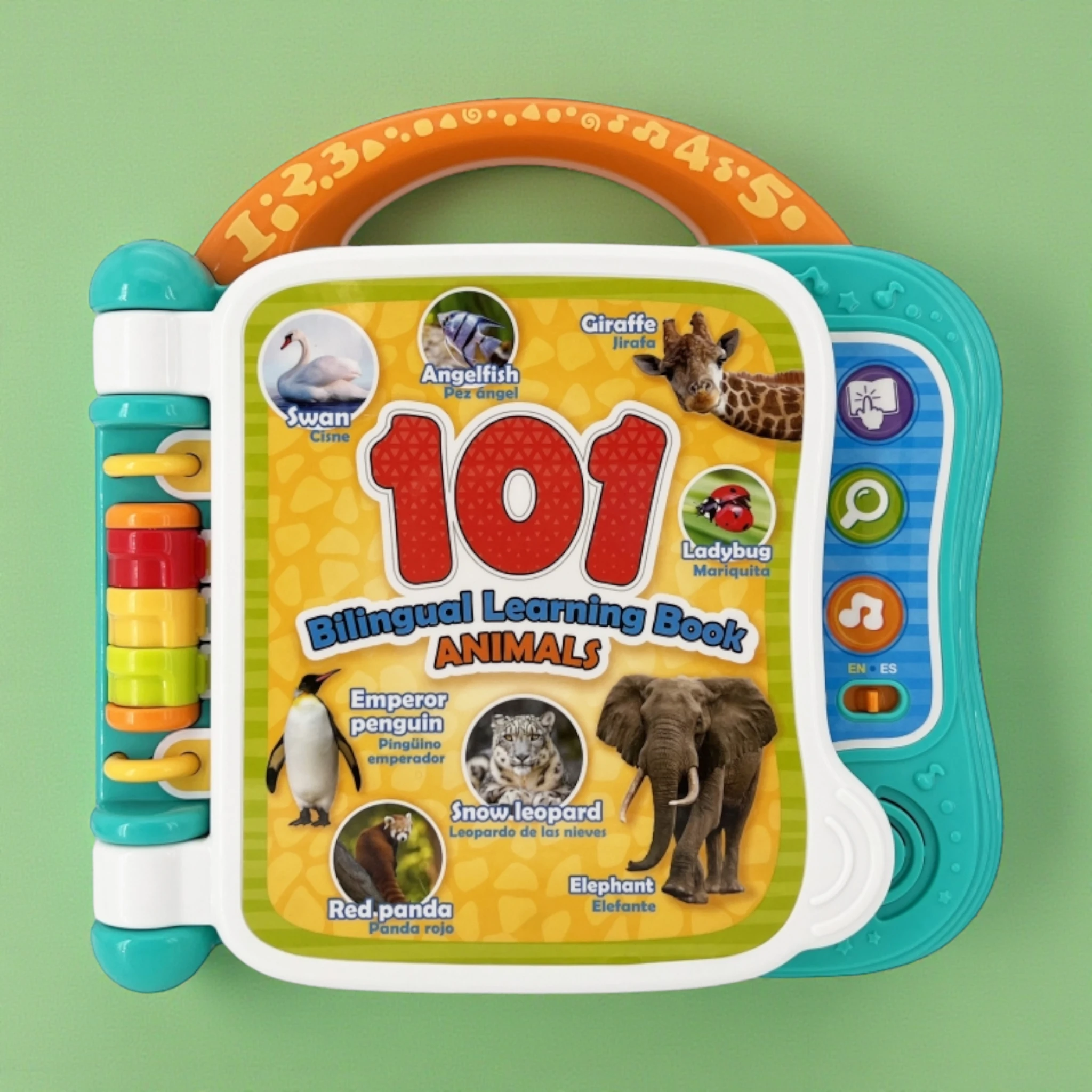 بناء المفردات أصبح سهلاً وممتعاً! هذا الكتاب التعليمي ثنائي اللغة هو الأداة المثالية لتقديم اللغتين العربية والإنجليزية لطفلك. يتميز بـ 10 صفحات ملونة تحتوي على رسوم توضيحية لأكثر من 101 كلمة عن الحيوانات. مع 3 أوضاع لعب تفاعلية (الكلمات، الأصوات، والحقائق الممتعة)، يمكن للأطفال النقر على الصور لسماع الكلمات والنطق الصحيح، مما يعزز مهارات الاستماع والتعلم المبكر .