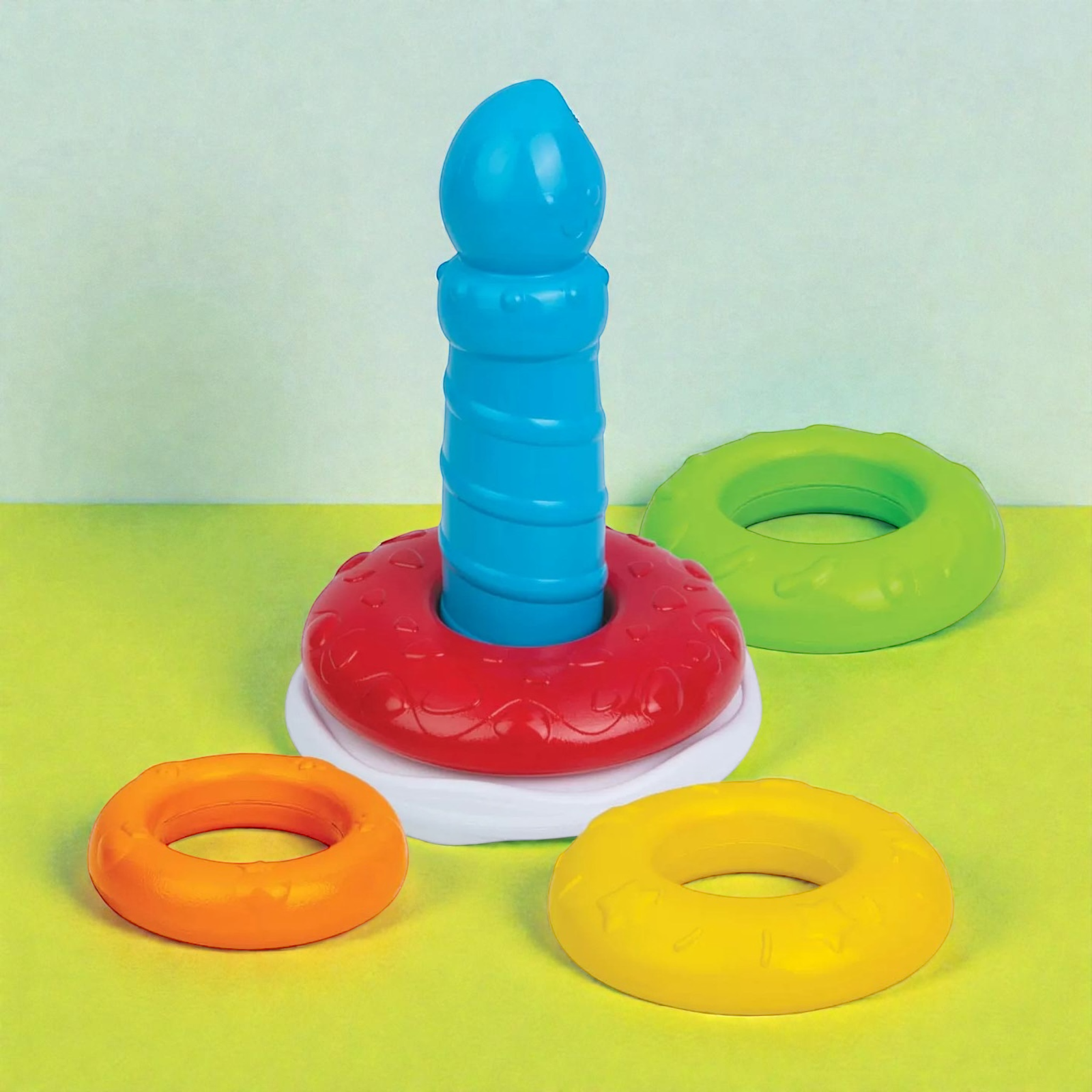 المكونات: تحتوي على قاعدة دائرية (roly-poly base) و5 حلقات ملونة بأحجام مختلفة.