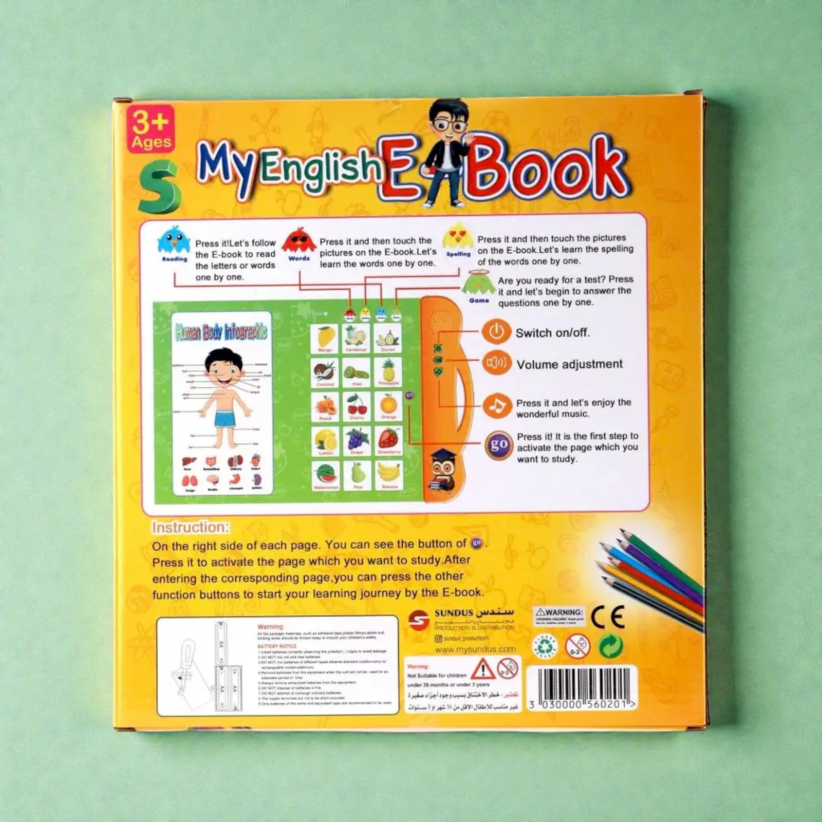 كتاب إلكتروني تفاعلي مصمم لمساعدة الأطفال على تعلم أساسيات اللغة الإنجليزية. يحتوي الكتاب على صفحات ناطقة تعلم النطق الصحيح للكلمات والحروف والأرقام، مما يجعل عملية التعلم ممتعة وسهلة الفهم.